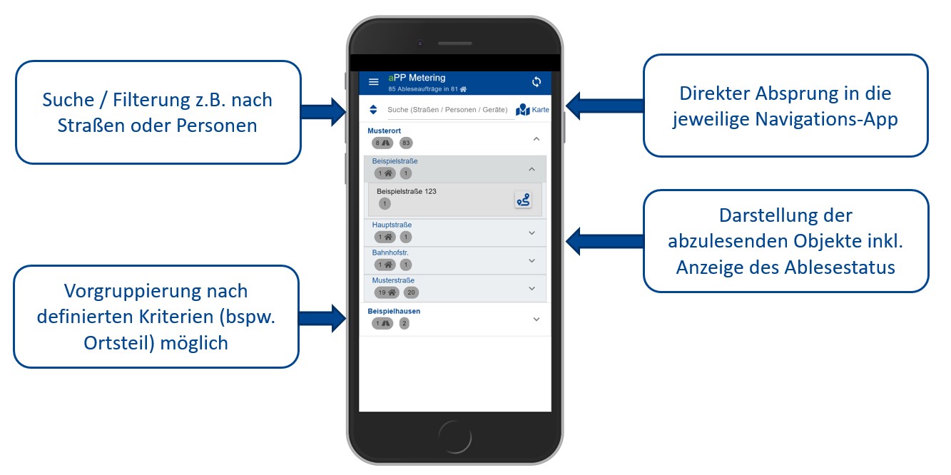 Durchzuführende Ableseaufträge werden den Mitarbeitern vorab im SAP zugeteilt. Der Mitarbeiter ruft seine Ableseaufträge übersichtlich und nach individueller Filterung (z.B. nach Personen oder Straßen) mit dem jeweiligen Ablesestatus ab. Eine Vorgruppierung der Ableseobjekte kann in der App nach bestimmten Kriterien (z.B. nach Ortsteilen) durch den Ableser selbst vorgenommen werden.