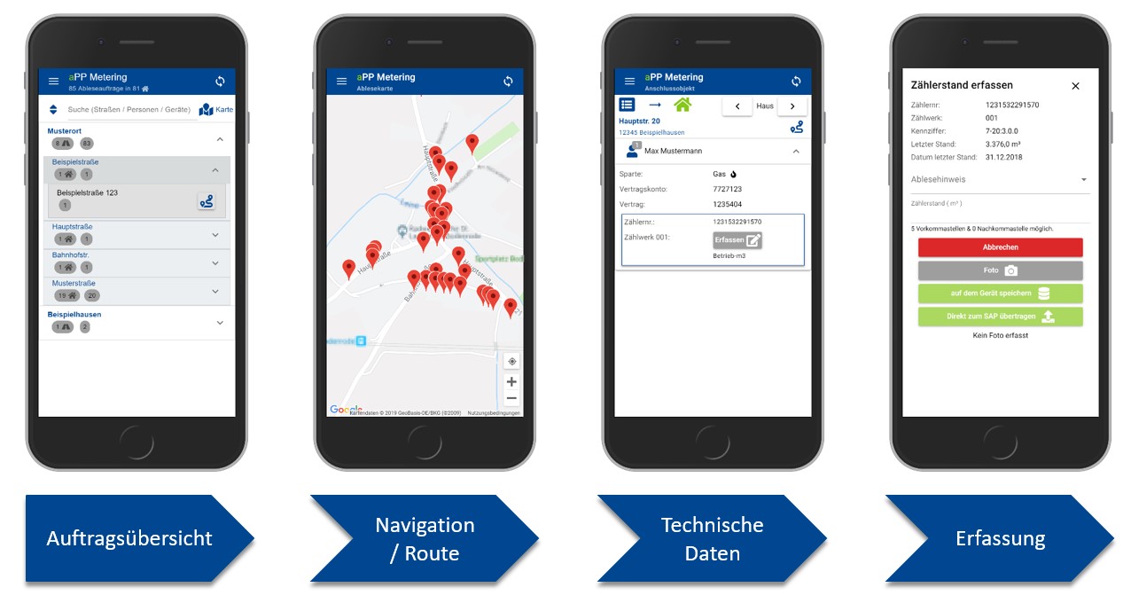 Bei der eigentlichen Zählerstandserfassung kann der Mitarbeiter entweder die Ablesedaten lokal auf dem Gerät speichern oder diese mittels direkter SAP-Anbindung und Live-Synchronisation in das SAP übertragen. Ein Foto des Zählers kann ebenfalls mit der App erfasst werden. Dieses wird in das Archiv mit SAP-Anschluss übertragen und mit der Marktlokation im SAP verknüpft werden.
