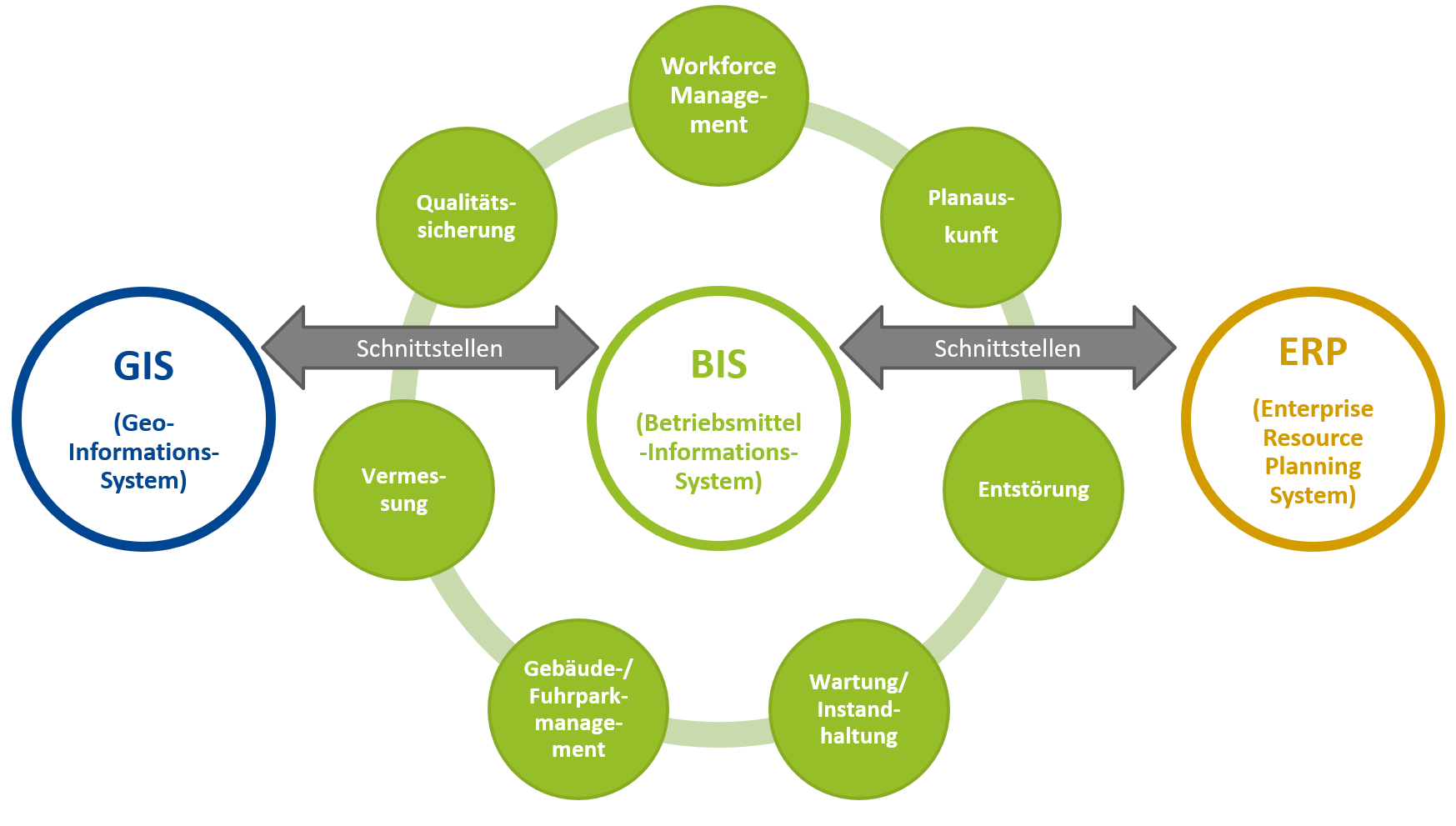 Hier planen, verwalten, dokumentieren, steuern und überwachen Ihre Mitarbeiter: innen die Betriebsmitteldaten. Schnittstellen zum GIS oder ERP-System verknüpfen die Informationen mit Ihren technischen und kaufmännischen Systemen, so dass Sie unternehmensweit von den Daten profitieren (z.B. Entstörungsdienst, Gebäude-/Fuhrparkmanagement, Planauskunft, Qualitätssicherung).